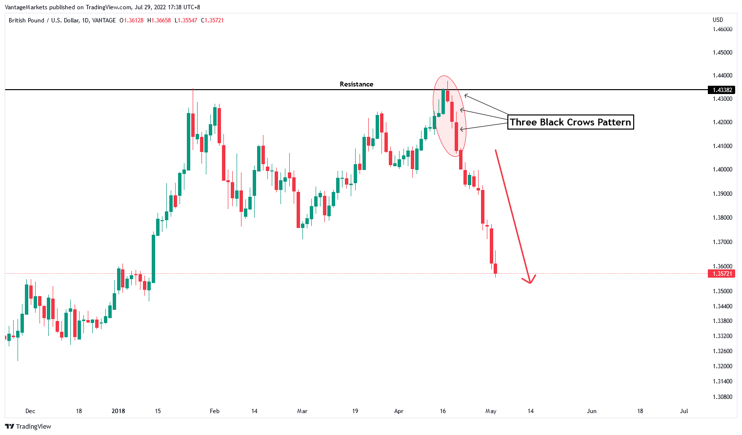 | Three Black Crows | Three candle patterns All three candles are bearish Candle body size increases Appears at resistance | Bearish |
