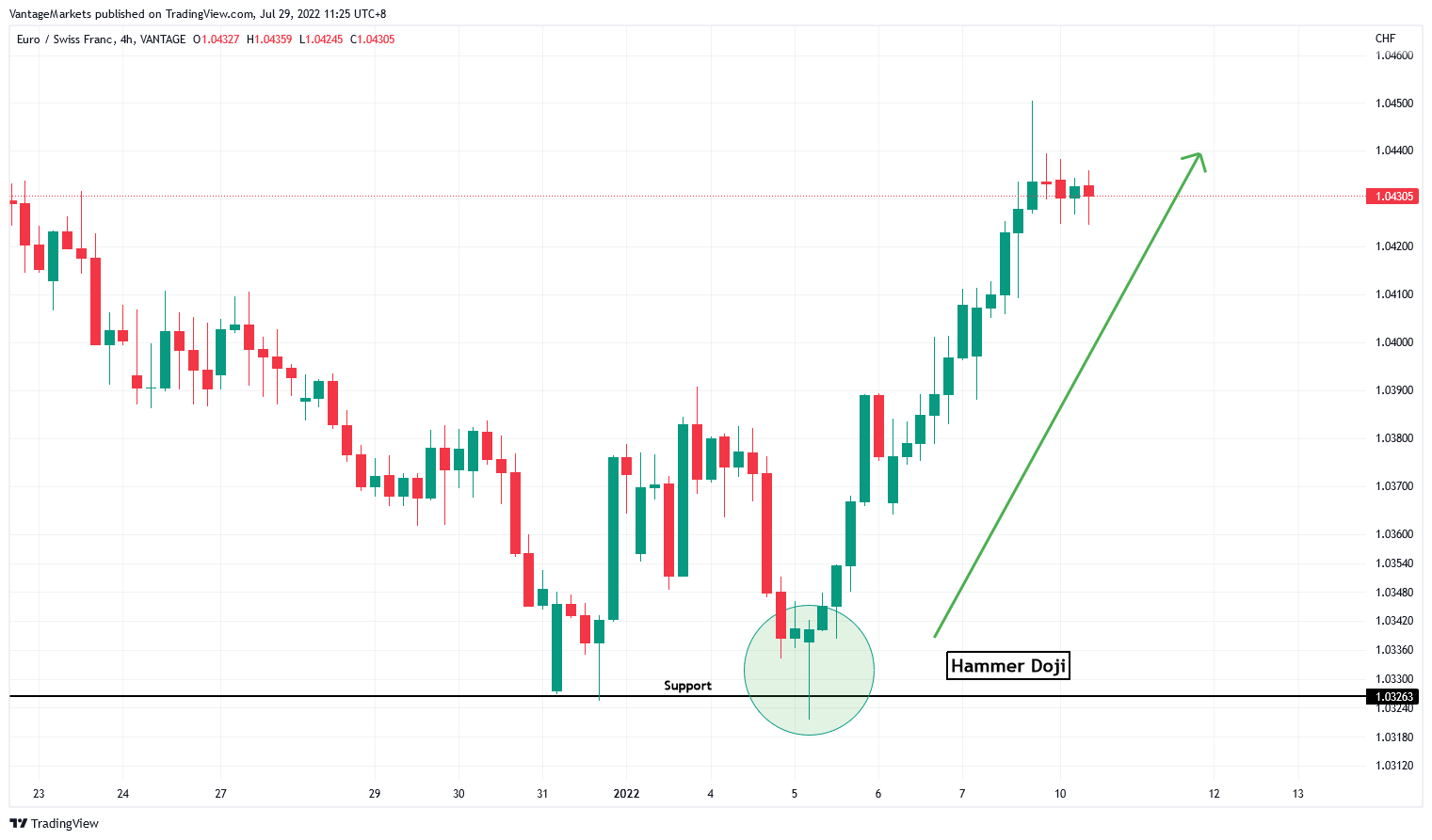 In figure 3, the formation of the Hammer Doji at a support level provides the trader with insight that markets could turn from bearish to bullish.