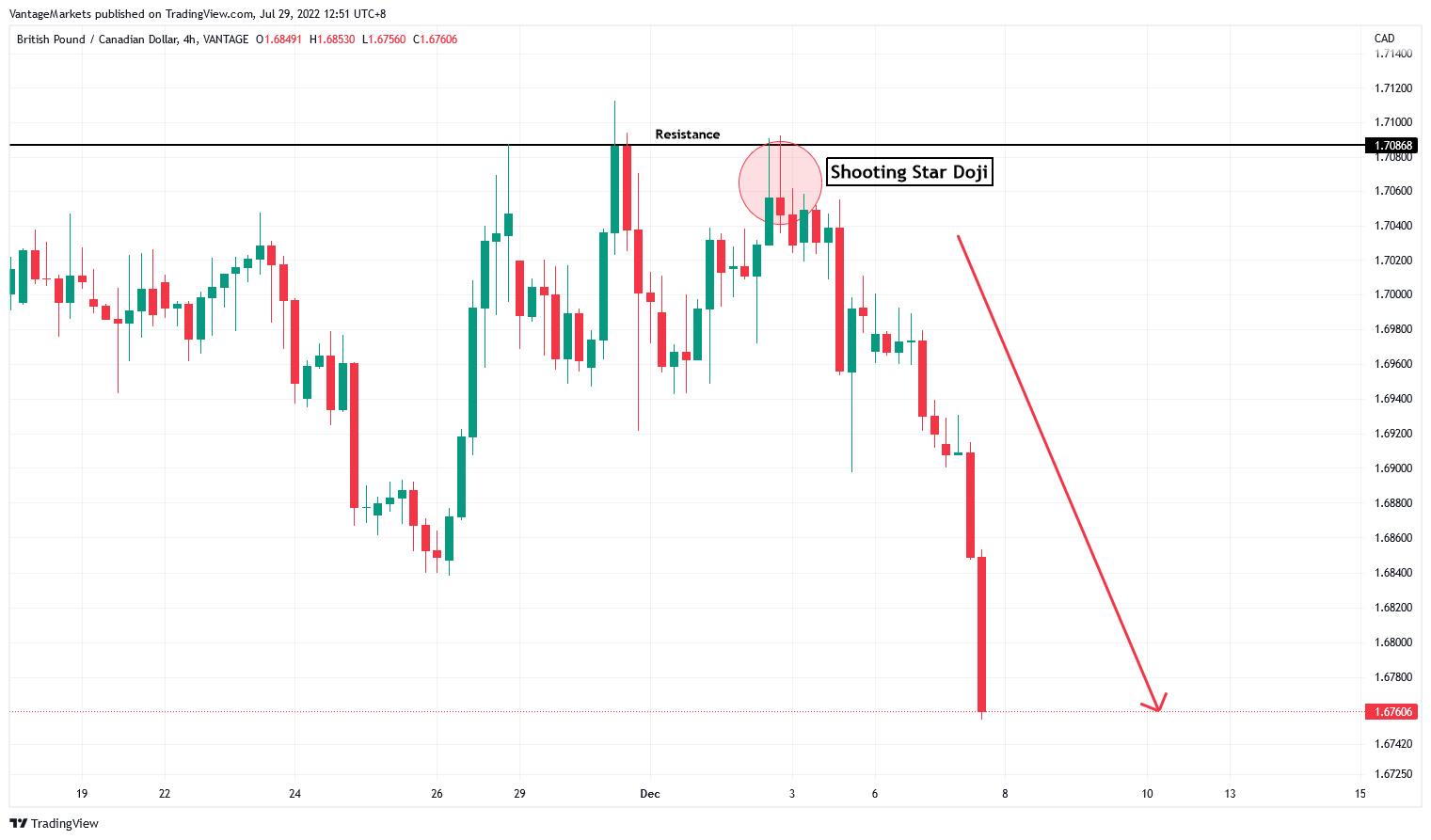 Figure 4 depicts a Shooting Star Doji forming at a critical resistance level. This should hint a trader that markets could turn from bullish to bearish.