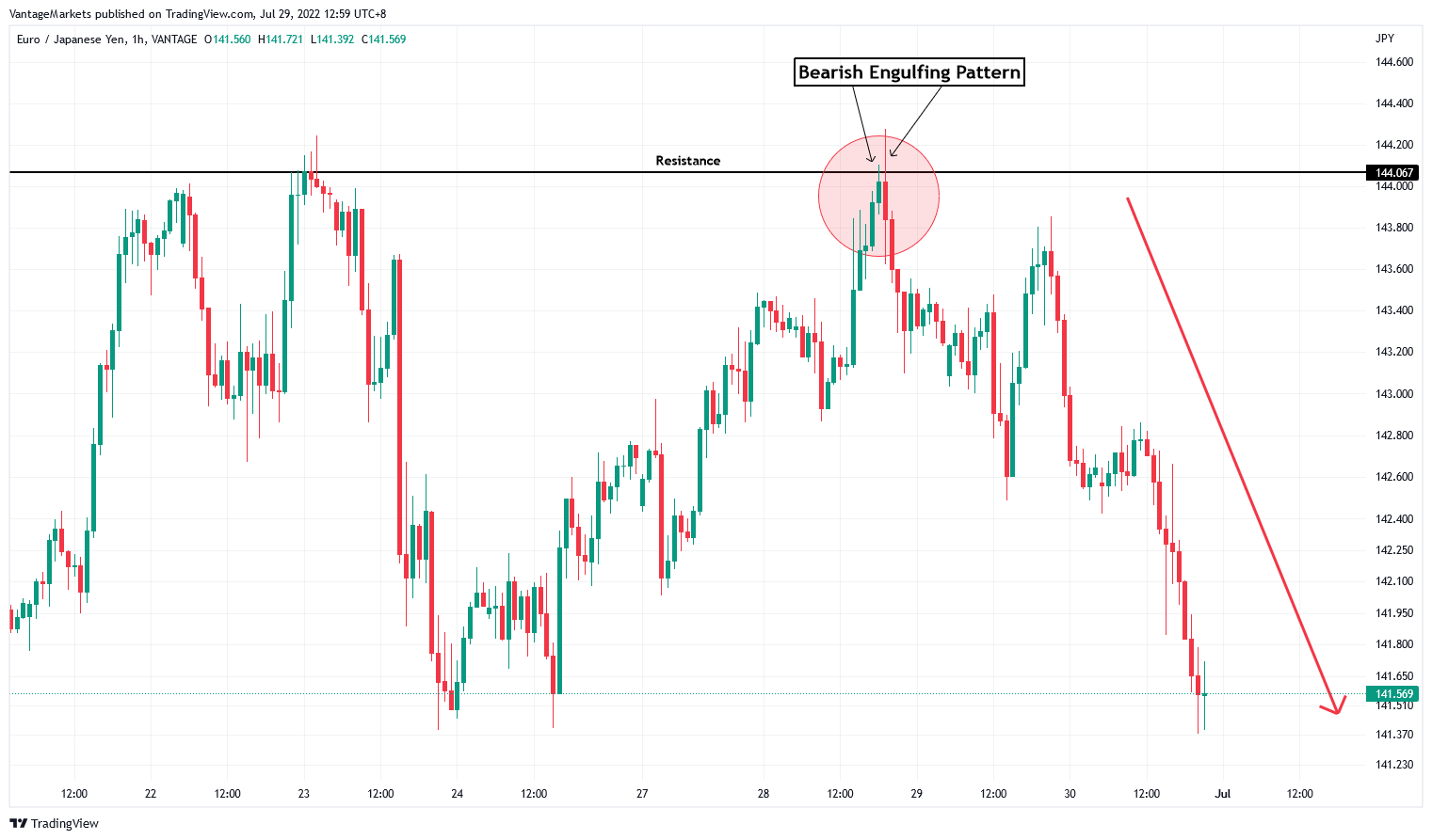 | Bearish Engulfing | Two candle patterns Second bearish candle body engulfs first candle body Appears at resistance | Bearish |