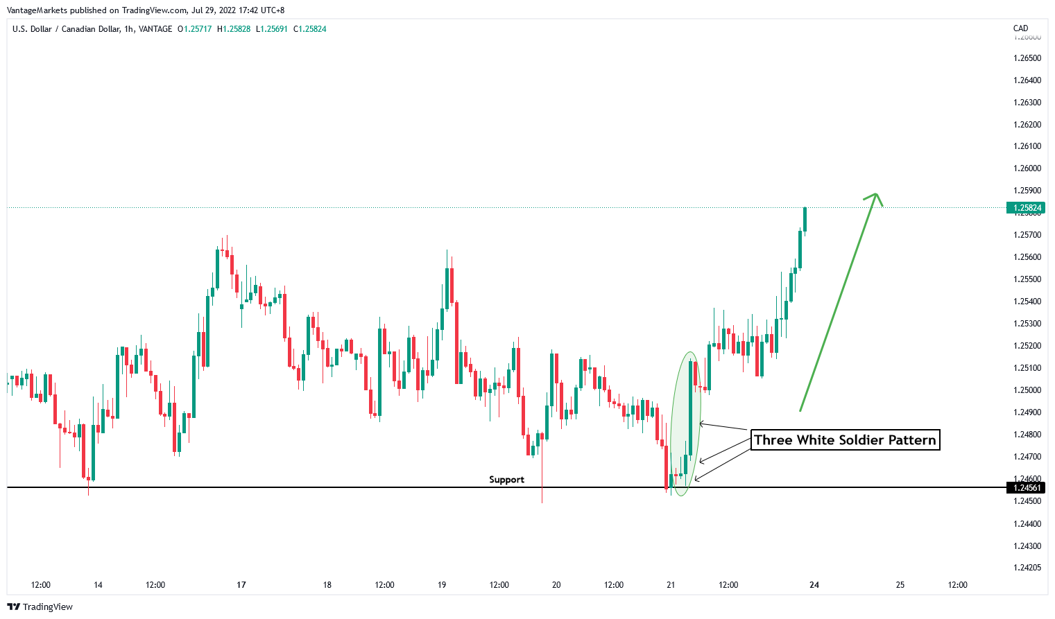 | Three White Soldiers | Three candle patterns All three candles are bullish Candle body size increases Appears at support | Bullish |