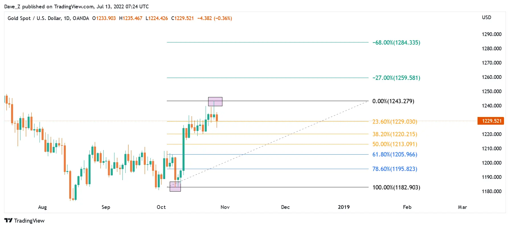 Assuming a bullish bias, figure 1 shows an identification of a swing low to swing high on gold using the Fibonacci Retracement tool as indicated by the purple boxes.