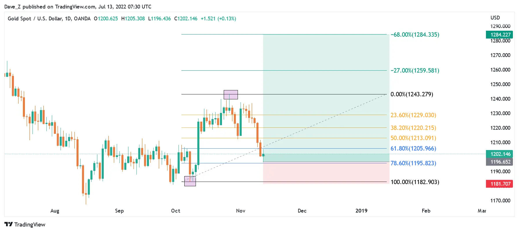 In figure 2, gold markets retraced to 78.6% Fibonacci Retracement level which signifies a possible buy trade idea. A general rule of thumb is placing the stop loss one Fibonacci level below the entry, in this case, below the 100% level. The take profit level used would be the -68% level, giving this trade a potential risk to reward ratio of 1:5.8.