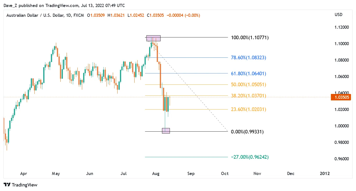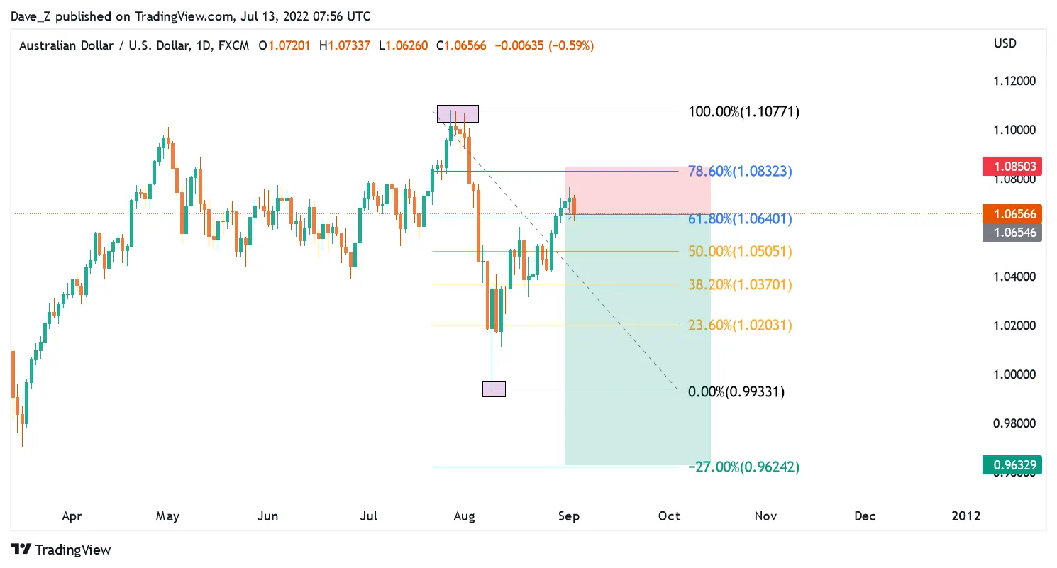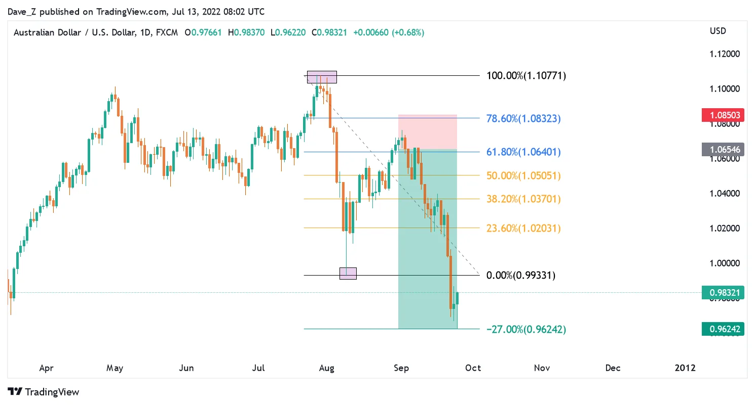 In figure 5, AUDUSD can be seen retracing into the 61.8% level, giving rise to a possible sell trade idea with stop loss one level above the entry (78.6%) and take profit level at -27%. The potential risk to reward for this trade would be 1:5.2.