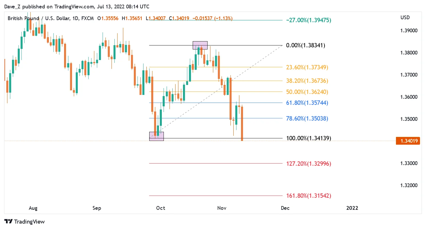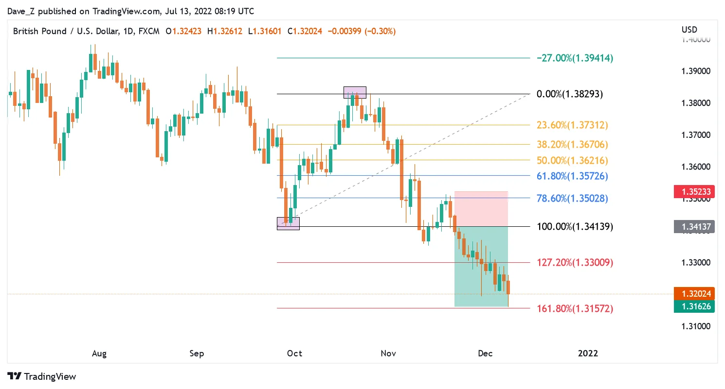 | 127.2%. 161.8% | Reversal levels 1 & 2, if final retracement level (78.6%) does not hold. |