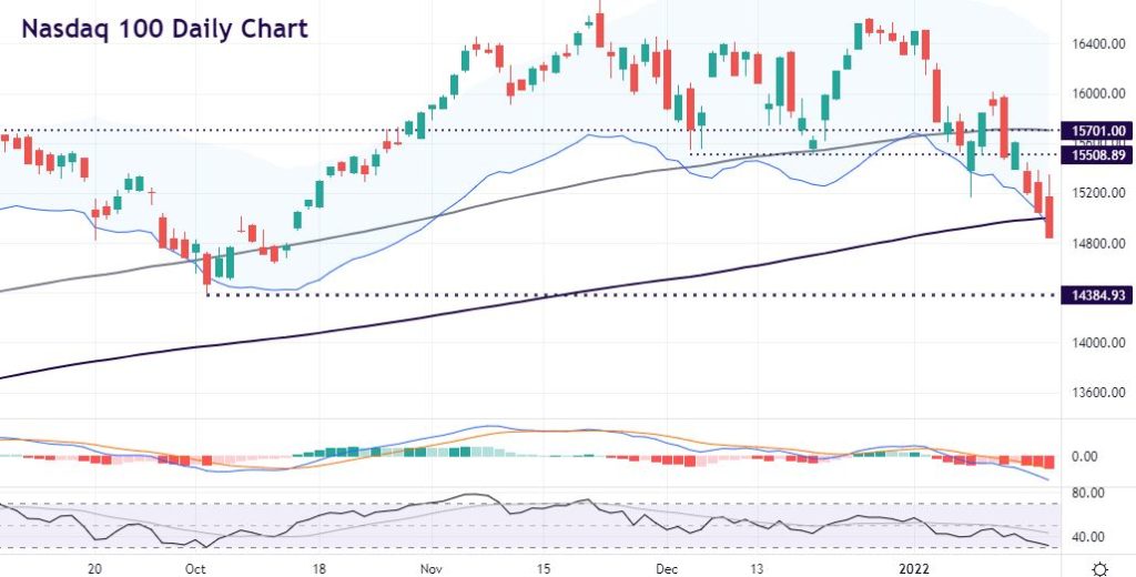 After finding support above 15,508 last week, the Nasdaq 100 briefly traded back above the 100-day SMA around 15,700. But this support was lost, and we’ve had three straight days of losses taking us through Fib levels and the 200-day SMA at 15,007.