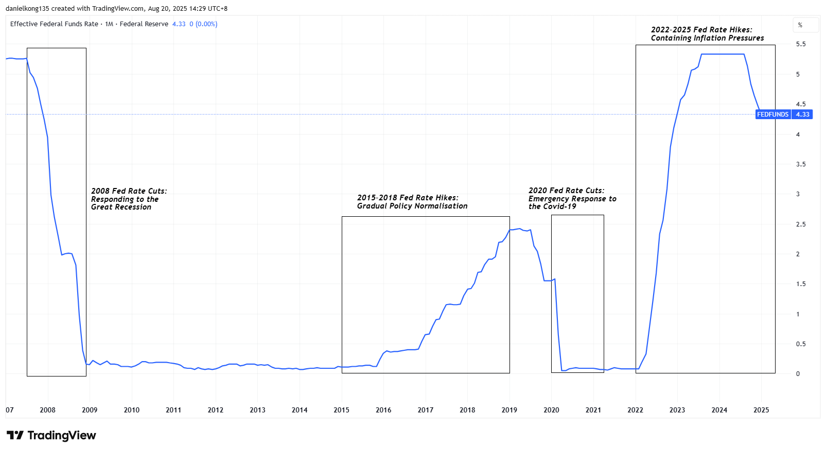 - “Effective Federal Funds Rate (I:EFFRND) – YCharts”. https://ycharts.com/indicators/effective_federal_funds_rate . Accessed 20 August 2025.
