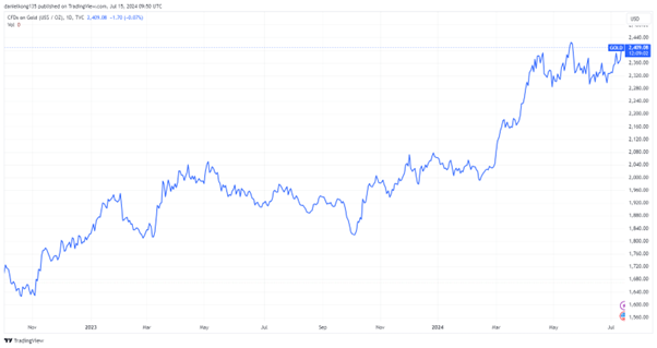Chart 1: Gold Price from 3 October 2022 to 14 July 2024. Sourced from TradingView (https://www.tradingview.com/x/aWPx1XOR/)