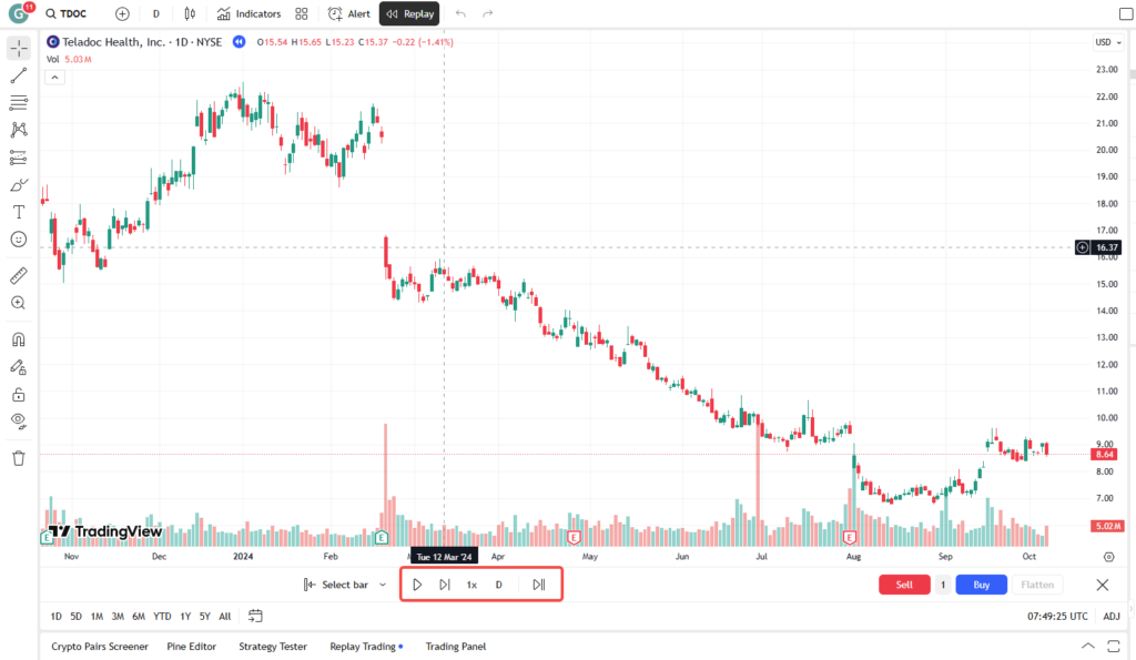 - Use the Bar Replay tool to manually simulate trades on historical charts by day and higher timeframes (but not by the minute or second)