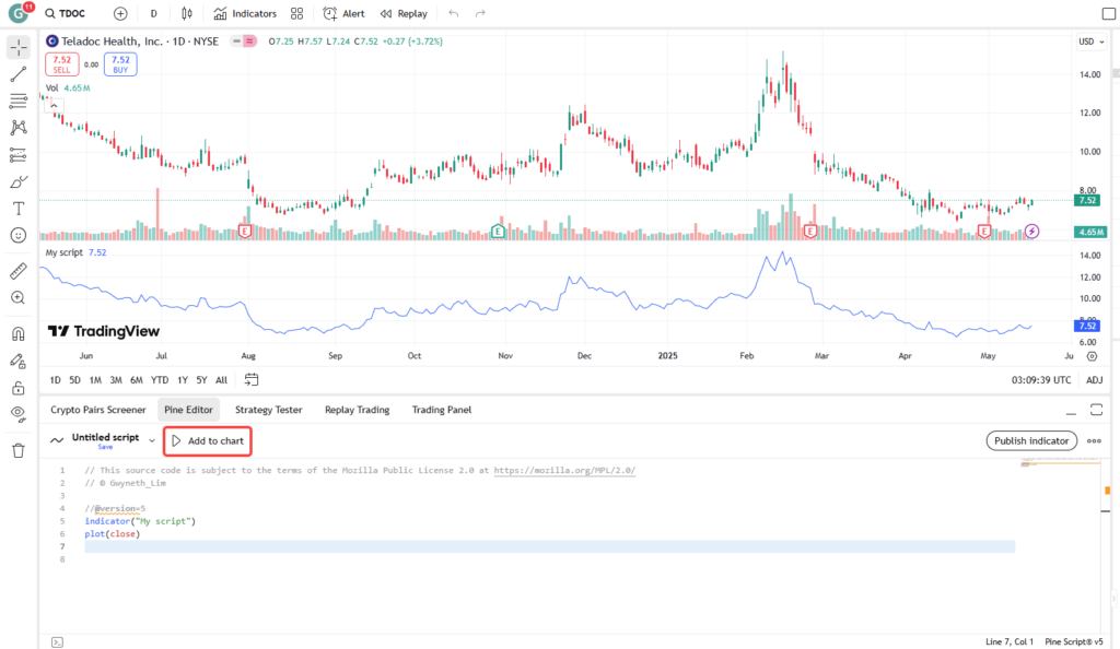 Once your script is ready, click Add to chart to overlay the strategy and see how it performs historically.