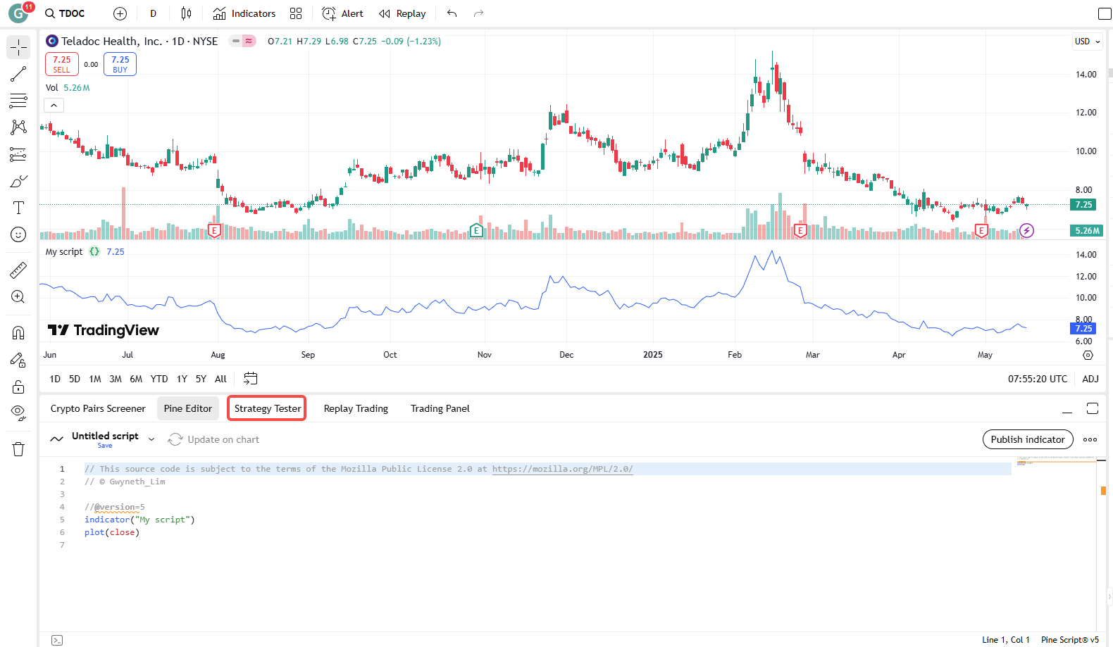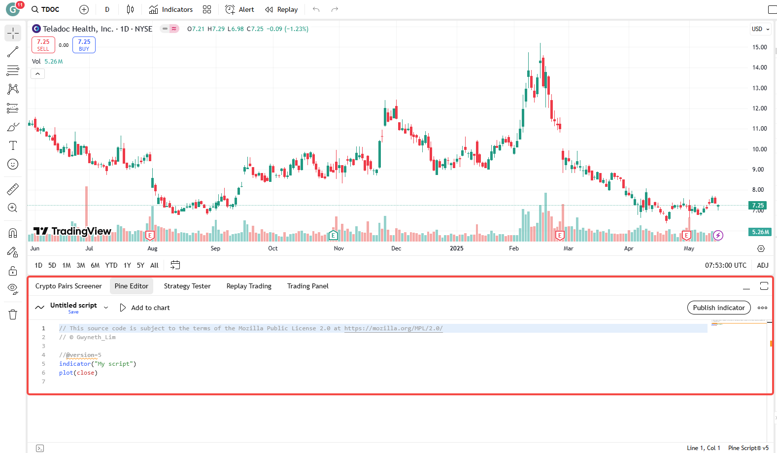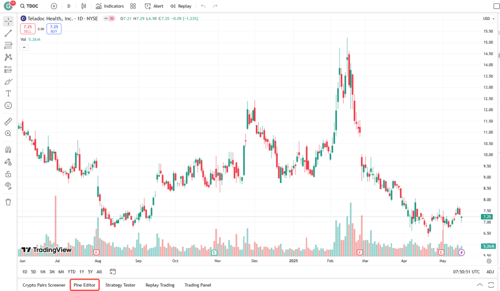 At the bottom of the TradingView interface, click on Pine Editor to begin writing or modifying your strategy.
