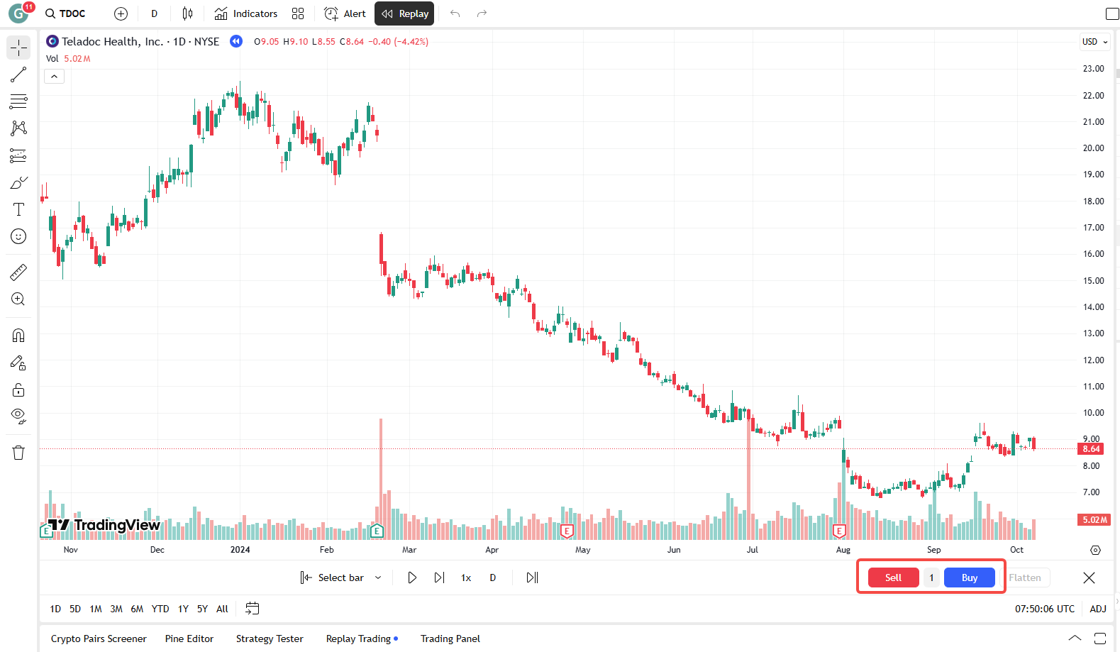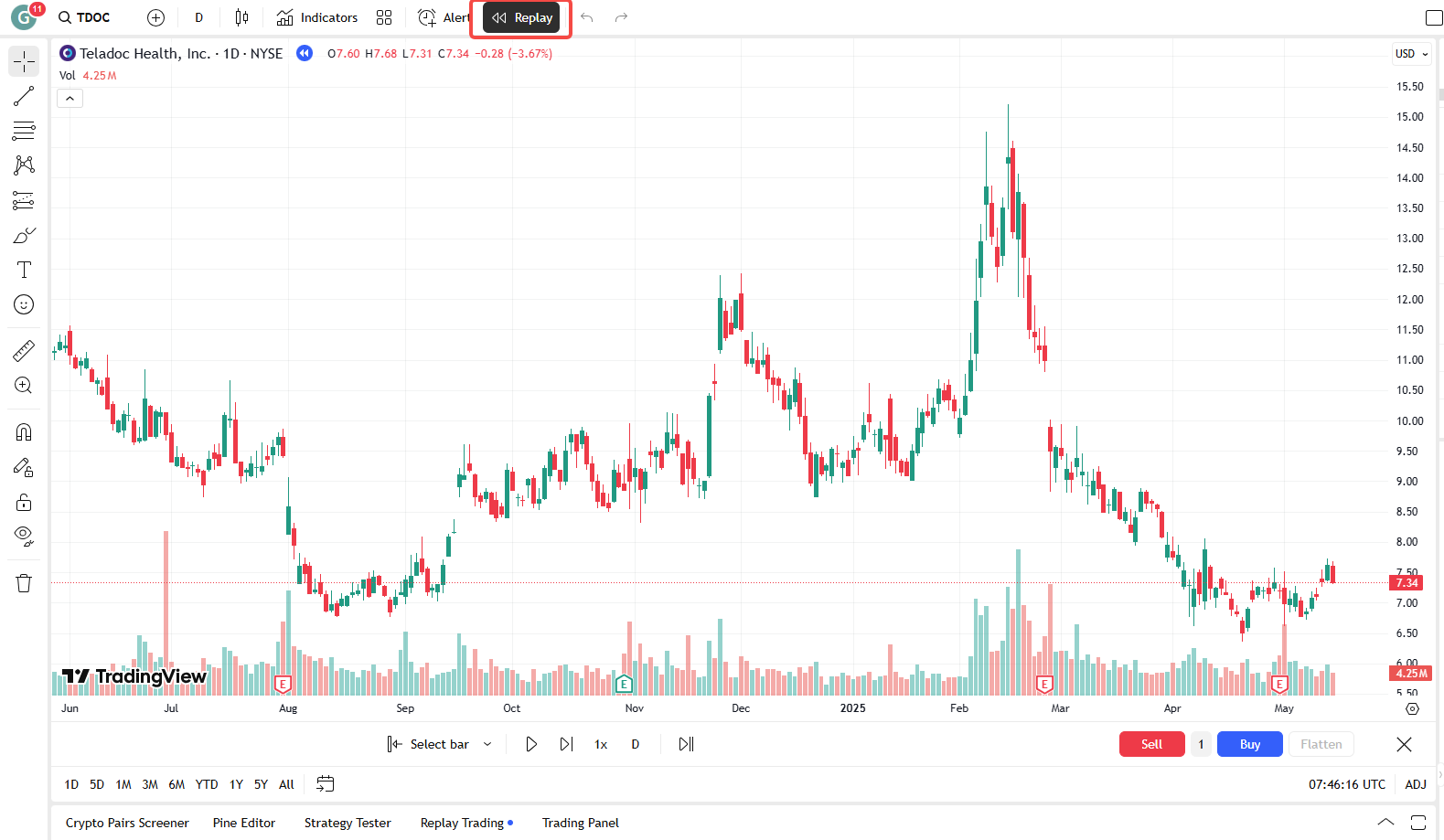 Click the Bar Replay icon in the toolbar. This tool lets you ‘rewind’ the market and simulate trading in the past.