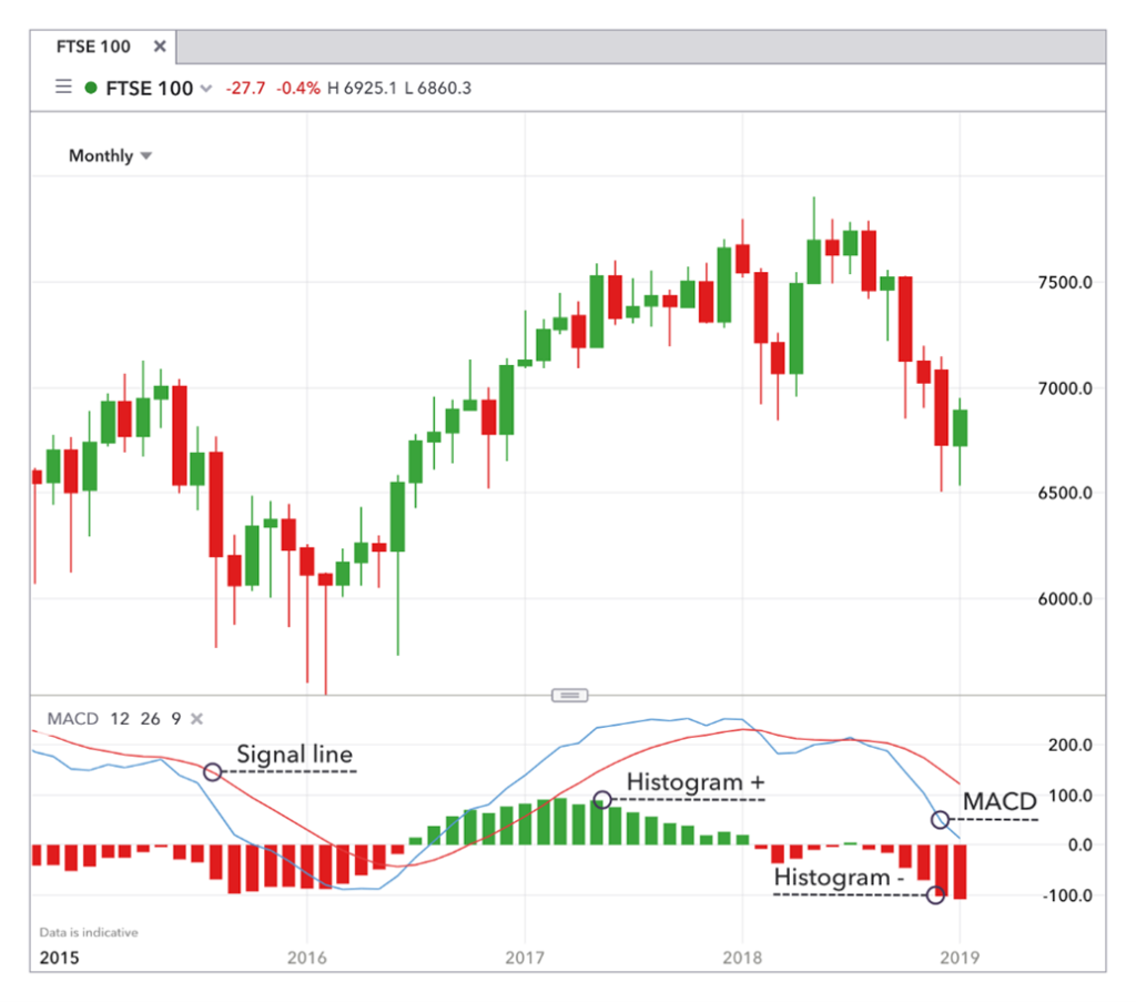 Let’s say a trader chooses to use the Moving Average indicator. This smooths out price data on a chart because it converts all the price data into average prices and represents them in the form of a flat line. A trader can choose various timeframes when using this indicator. While short-term traders use 30-minute, one-week or 10-day simple moving averages, long-term trend traders use 200-day, 100-day, and 50-day moving averages. When the flat line moves downward, the market is said to be declining or in a downtrend. Similarly, when it moves upward, the market is said to be rising or in an uptrend.