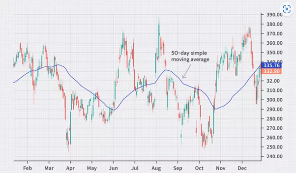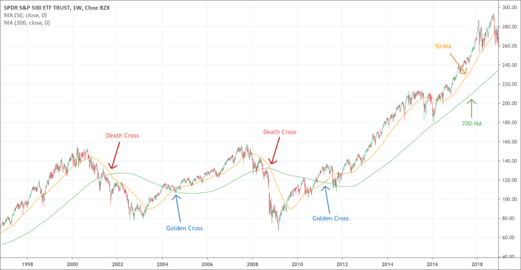 When a shorter moving average (say 50-day MA) crosses above the longer moving average (say 200-day MA), it is considered a bullish crossover and is known as the Golden Cross. When the shorter MA goes below the longer one, it is considered a bearish crossover and is known as the Death Cross.
