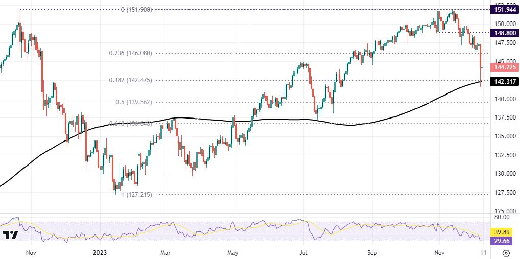 USD/JPY had its biggest one-day fall since January. The sharp sell-off was fuelled by comments from BoJ Governor Ueda who said policy management would become even more challenging from year-end and into next year. He flagged that several options could come next. The 200-day SMA is 142.27. The Fib level (38.2%) of this year’s rise is 142.47.