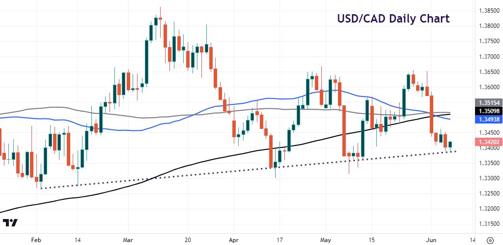 EUR dropped below 1.07 and remains lacklustre. Softer eurozone data and inflation expectations are painting a weakening economy in the region. GBP printed a relatively narrow range “inside day” around 1.24. USD/JPY pulled back from the resistance zone around 140 amid narrowing yield differentials. AUD is just about higher this morning, gaining for a fifth straight session. The RBA’s surprise hike was partially offset by disappointing Australian GDP and China trade data. The 200-day SMA sits at 0.6690. USD/CAD has touched trendline support just above 1.34 a couple of times ahead of the BoC rate decision later today. Consensus expects no change to rates.