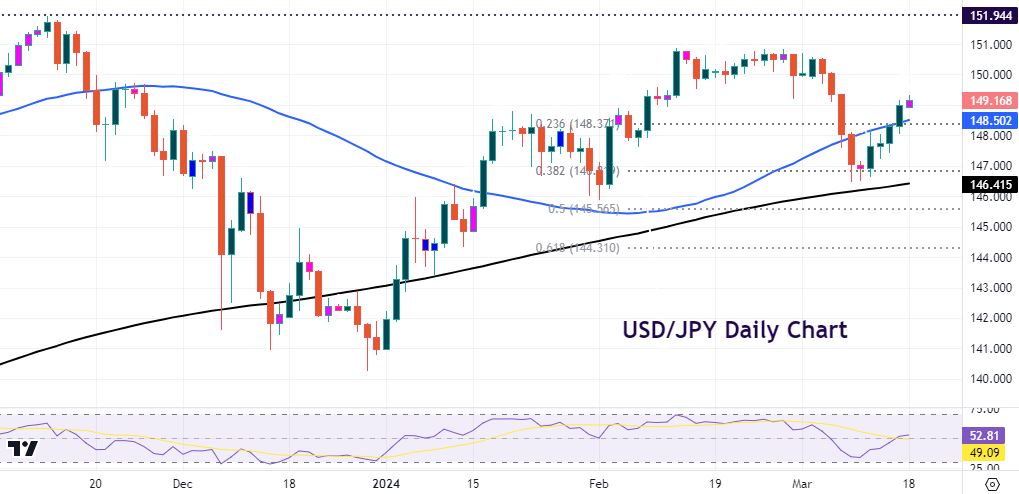 Interestingly, amid all the clamour and local media reports of an imminent, historic rate hike, USD/JPY has advanced for five straight days as US Treasury yields have continued to move higher. Prices moved above the 50-day SMA at 148.50 on Friday. No move could see the major closer towards 150 unless there is strong, hawkish language signposting an April hike. Support is the 38.2% retracement level of this year’s rally at 146.85.