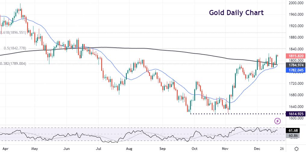 Since the current rally in gold in early November, prices have not dipped below the 21-day SMA. It has been trading around the 200-day SMA for the past few weeks which is now at $1784. The cycle high at $1824 is key. Above that is the 50% mark of this year’s decline at $1842. The June top is at $1879.