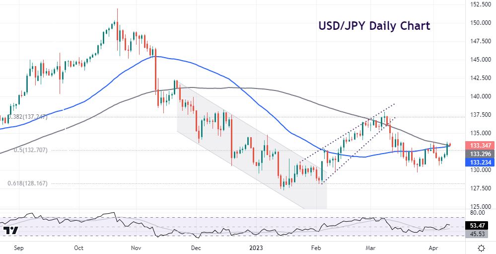 USD/JPY has been choppy since breaking down out of a rising wedge pattern just over a month ago. That pattern shows up when the price moves upward with pivot highs and lows converging to a single point known as the apex. The halfway point of the 2022 rally sits at 132.70. The 50-day and 100-day SMAs are at 133.23 and 29. Break above these and the major can get to 136.