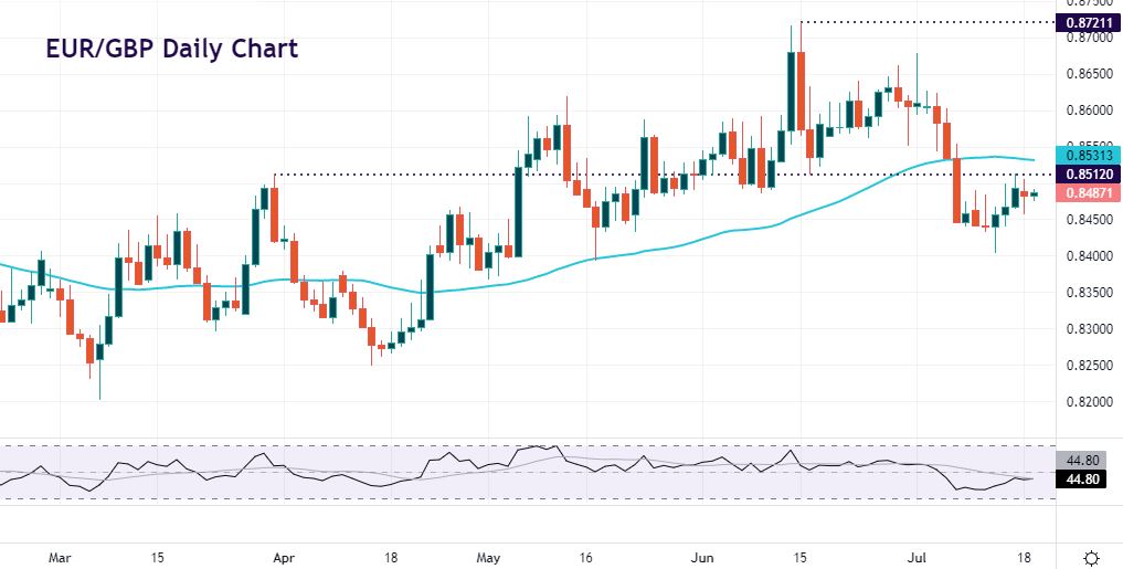 GBP is expected to strengthen on the back of solid data. Continued tightness is forecast in the jobs figures, while another steep inflation number should keep rate hike bets elevated. Chances of 50bp rate hike at the 4 August BoE meeting are rising. EUR/GBP is quite messy truth be told. It topped out in mid-June at 0.8721. The pair is now trading below the late March high at 0.8512. Resistance above here is the 50-day SMA at 0.8513. Support come in around 0.8450 and then last week’s low at 0.8403.