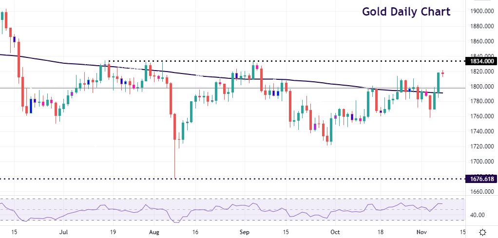 Gold hit its highest levels in over two months and is holding at the highs this morning. Major resistance comes in around $1834. This barrier has held prices on several occasions since mid-July. Support is initially the halfway point of the June to August move at $1798. The 200-day SMA sits just below at $1780.
