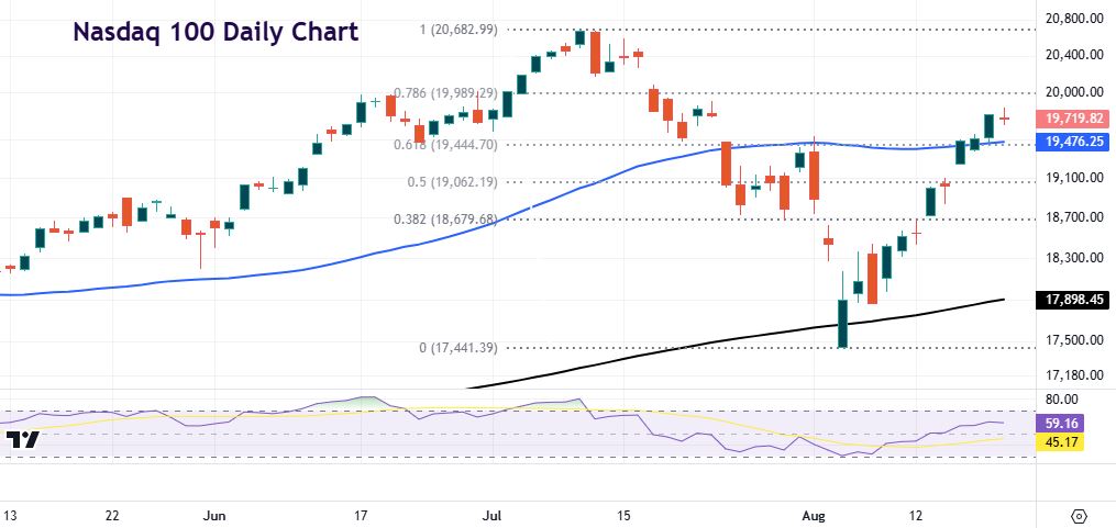 But since then, buyers have stepped in with eight consecutive days in the green, which was last seen in early November 2023. The bullish move has taken out various Feb retracement levels with initial support now at the 61.8% mark of the July/August sell-off at 19,444. The 50-day SMA sits near here at 19.476. The next upside level is the minor Fib level (78.6%) at 19,989, before the record high at 20,682.