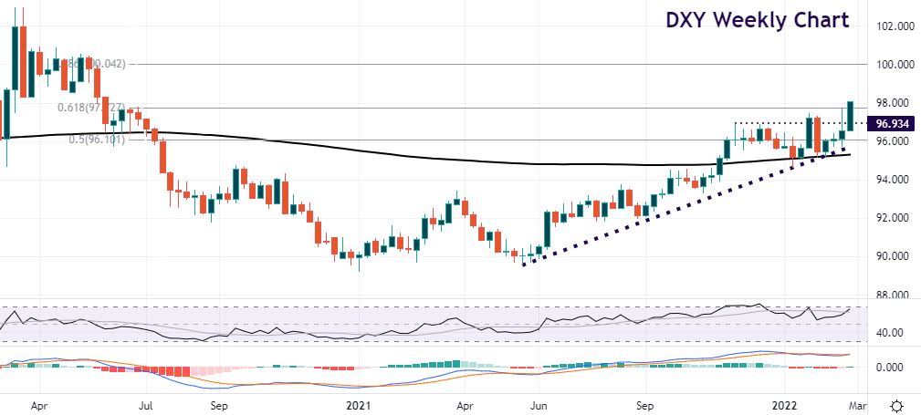 It’s taken a Russian offensive to push investors towards the safe haven status of the dollar and new cycle highs. Rates markets have been volatile this week too. But Fed Chair Powell’s testimony restored 20bp to the expected Fed tightening cycle, after the midweek one-day crash in rates.