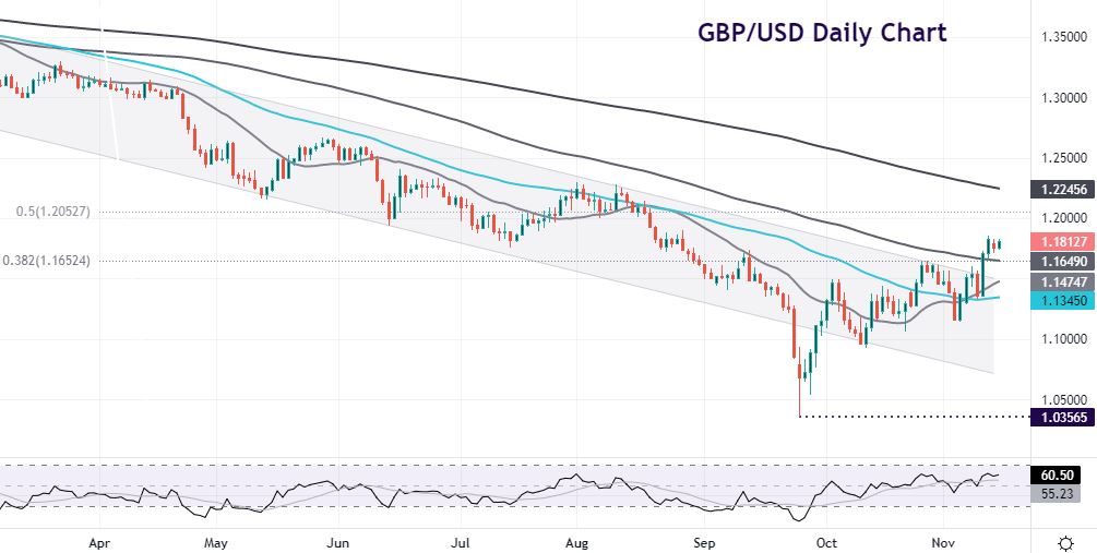 Dollar dynamics and risk sentiment will also drive GBP this week. Cable paused yesterday after two bullish days saw a 500 pip rise from low to high at the end of last week. Prices are consolidating with the break of the major bear trend since the start of the year. Support is 1.1649/52 and 1.1550 is the top of the downward channel. The main upside target is 1.2052. That’s the 50% Fib level of the 2022 decline.