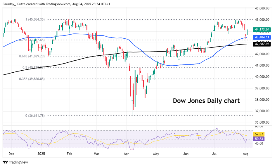 The Dow Jones suffered its biggest weekly drop since Liberation Day in early April. The index of 30 stocks fell over 2.9% after the 1.2% sell-off after Friday’s NFP, its worst day since mid-June. Earnings on tap this include Dow heavyweights like Disney, McDonald’s and Caterpillar, plus Palantir. They will give us further insights into the broader economy while risk sentiment will be governed by the ongoing tariff drama, the reaction to the shocking US job numbers and Fed rate cut expectations. The Dow touched its 50-day SMA at 43,484 on Friday but closed above it. The 200-day SMA is below at 42,882. Bulls will look for decent company earnings to push it back closer to the record top above 45,000.