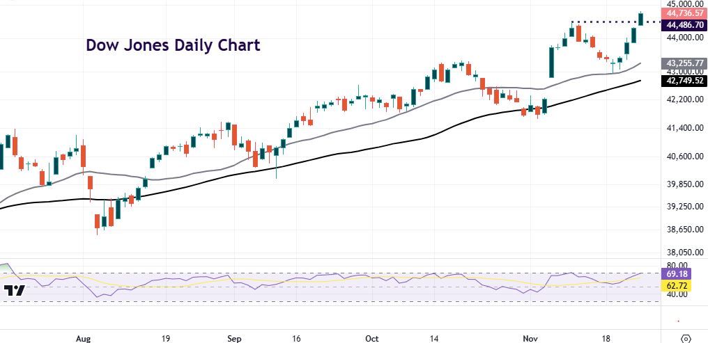 A fifth day of consectuive gains saw the Dow Jones Industrial Average push north to new record highs. The Bessent pick pleased stock bulls. Some commentators are talking about TINA again but in a slightly different context to recent times. ‘There Is No Alternative’ has previously been used to describe stocks generally being the only asset class to buy. Now it refers to US equities due to US exceptionalism and Trump unleashed. America is sucking growth away from the rest of the world and this contrasts sharply, as we have said, with other regions. What will change this current overwhelming theme for endless record highs in US stocks?