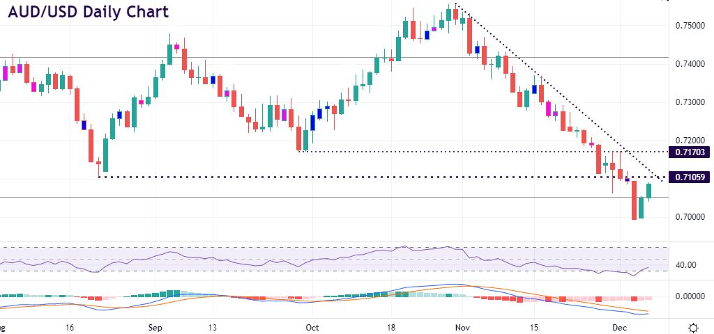 AUD/USD posted a new cycle low below the key psychological 0.70 level last Friday.  The November 2020 bottom sits at 0.6991 which reinforces this level of support. But the pair was heavily oversold, and the bulls are now enjoying two rare days of gains this week.