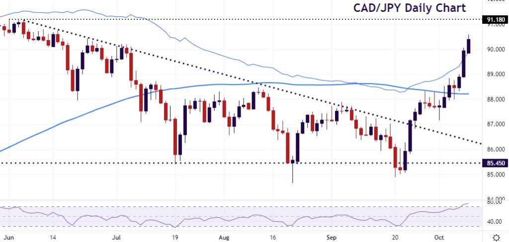 The safe haven yen is seeing selling to kick off the week. This has reinforced the push higher in CAD/JPY. After hovering above 88 and around the 100-day SMA, buyers have driven prices to levels last seen in June. The year-to-date high comes in at 91.18. But the pair very overbought on the daily RSI and through the upper Keltner channel. Support is at a Fib level at 89.78 and then 88.69.