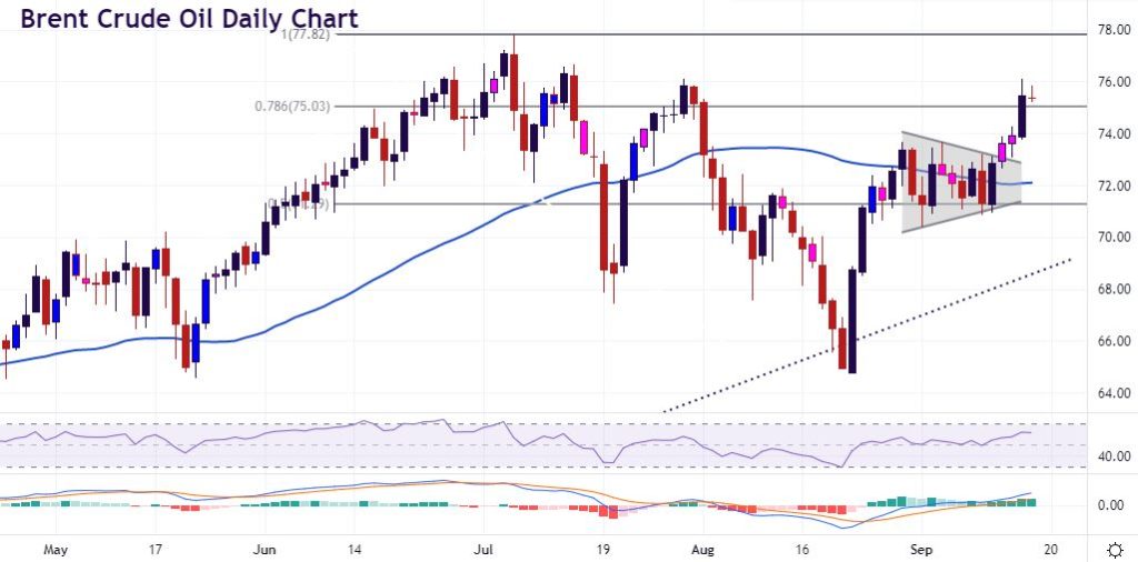 After making lows at $64.76 in late August, crude staged an impressive two-day rebound back to the 50% retrace level of the summer high to low move. Prices have then tracked sideways over the last couple of weeks. Monday saw a break out of consolidation and the larger-than-expected drawdown in US crude oil stocks propelled prices above $75. The 78.6% Fib level sits at $75.03 with the July top at $77.82. Support comes in at the top of the rcent range around $73.73.