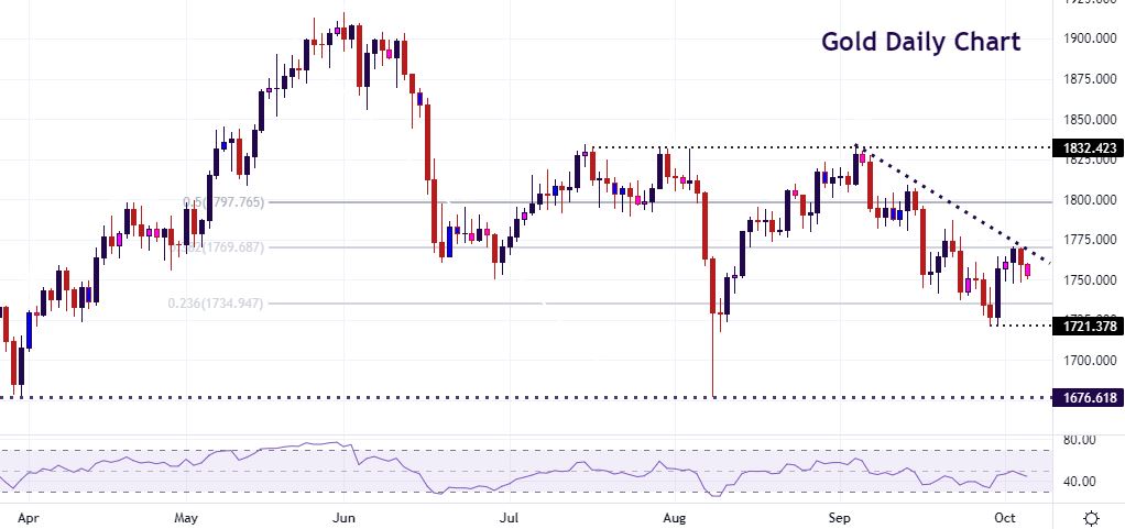 Rising US real yields and a strengthening dollar will continue to weigh on the precious metal. With the daily RSI pointing down again, the late September low is the first target for the bears. The summer spike low and previous year-to-date trough around $1677 is major support.