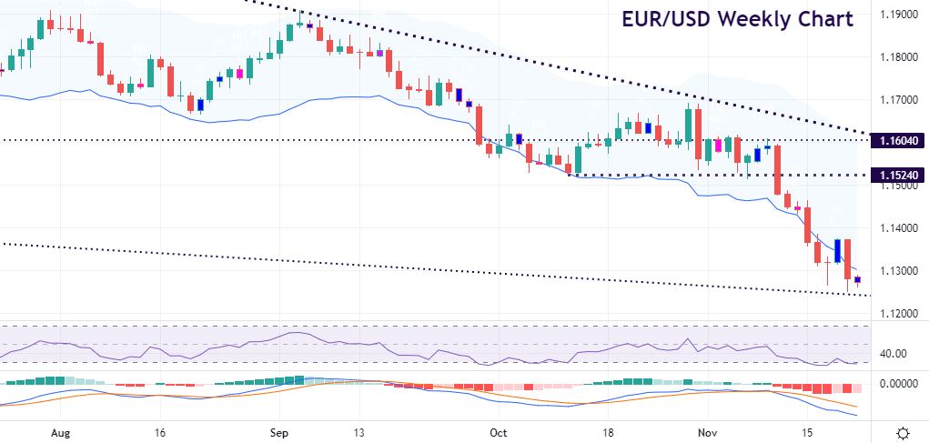 USD is close to reaching fresh cycle highs as new lockdowns loom in Europe. The recent high in DXY is 96.26. Friday’s low in EUR/USD is 1.1250, though the world’s most popular currency pair closed at 1.1290, its lowest since July. Austria has imposed its fourth national lockdown, while Germany is considering following suit. USD is near its strongest since early October versus the riskier AUD and CAD. Commodity-linked currencies are also pressured by the slump in oil.