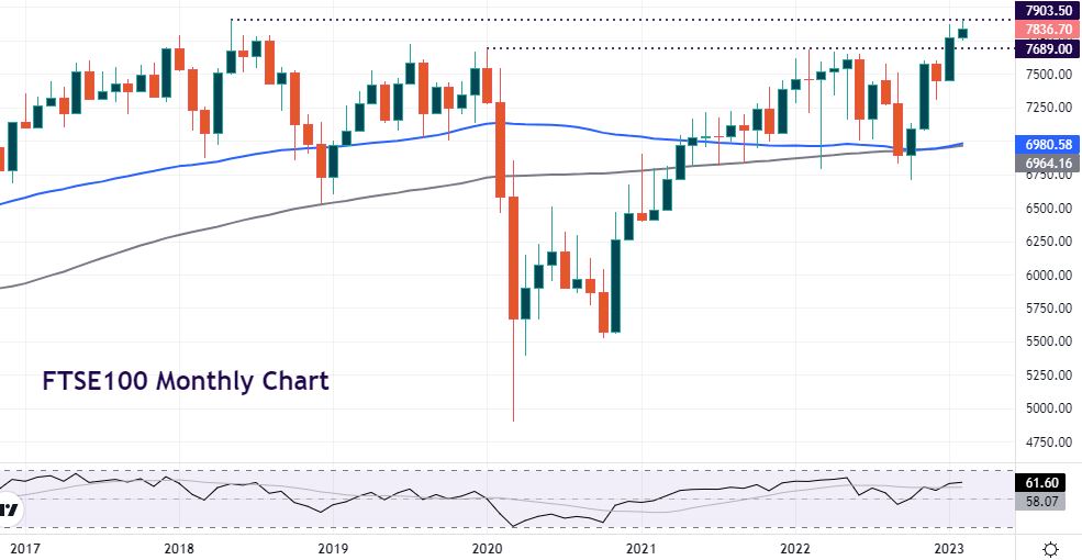 The UK’s FTSE 100 closed at 7902 on Friday, beating its previous peak in May 2018. The index had risen over 6% this year after closing nearly 1% higher in 2022. That made it the best performing developed market index in local currency terms.