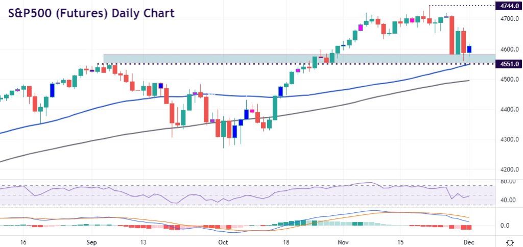US equities reversed Monday’s gains and dropped again as the market was hit by the double whammy of Powell and Omicron risks. The hawkish tone hit growth stocks with the S&P500 and Dow closing 1.9% lower. Cyclicals held up with tech and autos the leading sectors. But stocks are more buoyant this morning on comments by the Israeli health minister that vaccines may protect against the new variant. Futures are in the green with Asian markets reversing negative sentiment.