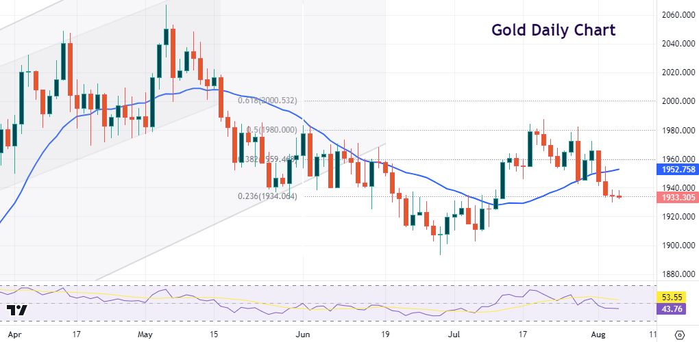 But more weakness in wages and the headline could underpin some support for gold. Surging yields need to slow and reverse for a more protracted move higher. The 50-day SMA is initial resistance at $1952. Support is a minor Fib level at $1934. The June low sits at $1893.