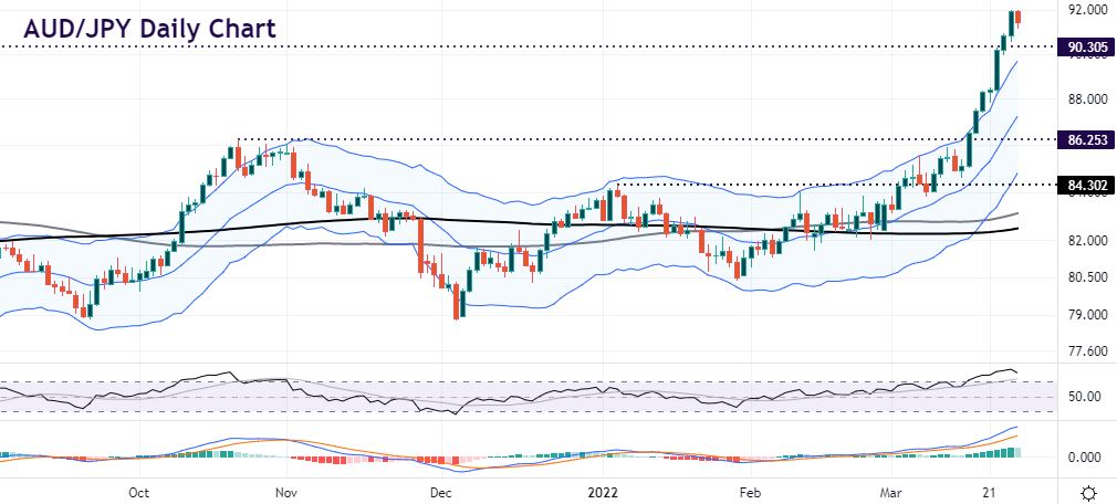 We can see the move higher clearly on the daily chart. Prices had been consolidating around 83 before the huge move this month. The pair is severely overbought on the daily and weekly chart. Upside targets are 92.69 and 92.97. Long-term support sits at 90.72 and the September 2017 high at 90.30. Below here are the October peaks around 86.25.