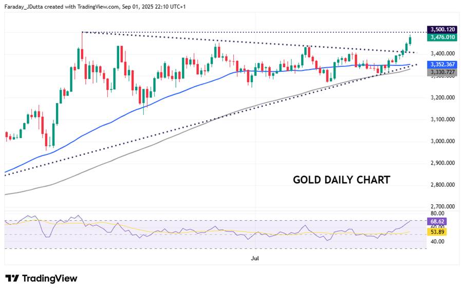 Bullion prices have broken to the upside after tracking sideways around the 50-day SMA, now at $3,352. Last week saw growing noise surrounding potential secondary sanctions on buyers of Russian oil and gas, which provided further support to the market. The Fed’s favoured inflation gauge, US core PCE came in line with expectations, cementing bets that the Fed will cut interest rates at its 16-17 September meeting.