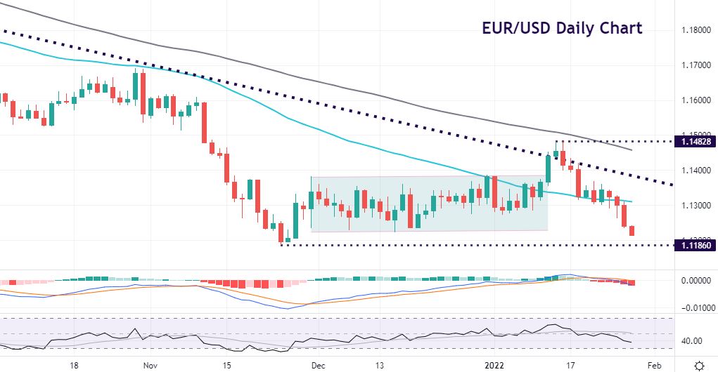 The dollar powered higher against the low-yielders like JPY, CHF and EUR. These currencies are most susceptible to higher US interest rates, with their central banks stuck on hold. Ukraine tensions are also continuing to dampen the euro especially. Bears are eying up the November low at 1.1186. With many analysts now revising higher their Fed rate forecast, expect more dollar strength towards 1.10 and below.