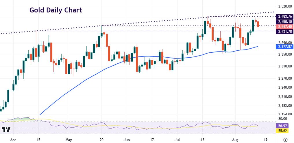 Strong resistance is obvious at the record high from mid-July at $2483. Prices have tested this on a few occassions intraday without any break through. There is a long-term upward trendline above here reinforcing this area. Previous all-time highs sit at $2450 and $2431.
