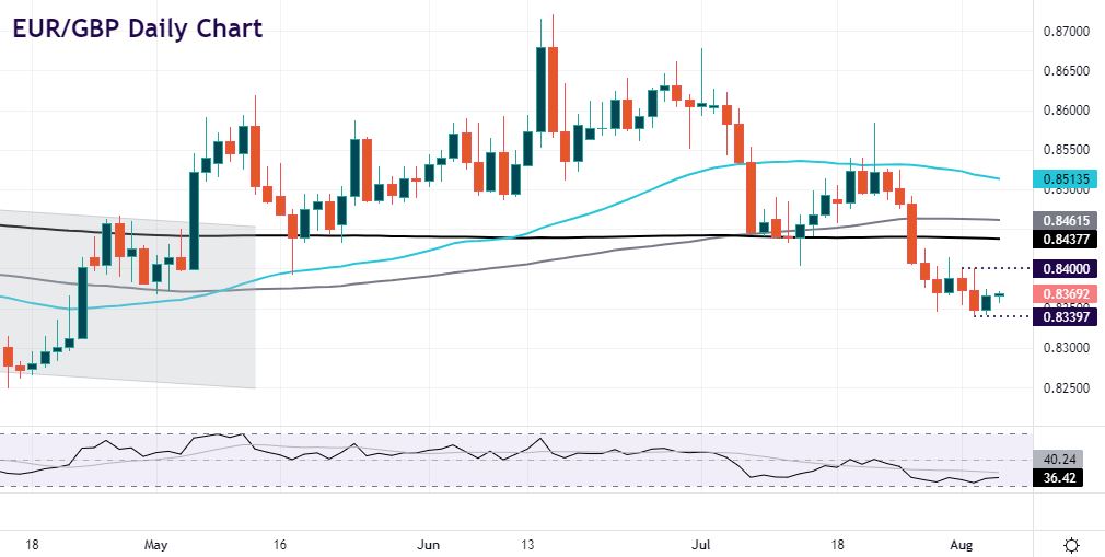 GBP/USD is currently trading around a zone of levels. This includes the 50-day SMA at 1.2188 and the mid-May low at 1.2155. There is also long-term trendline resistance/support around 1.2140. EUR/GBP looks more enticing with prices trading just above a low last seen in April. Support is 0.8339 with the downtrend relatively firm. Resistance is initially at 0.84.