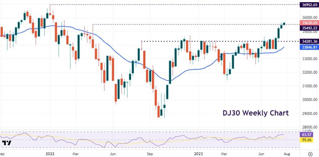 Stocks: US equities closed modestly lower on the first day of August. The benchmark S&P 500 lost 0.27% to 4576. The blue-chip index was dragged lower by consumer discretionary and utility stocks. The tech-laden Nasdaq dropped 0.25% to 15,718. The Dow printed a fresh 17-month cycle high at 35,679 before closing just below. Impressive gains were seen in Caterpillar after its results.