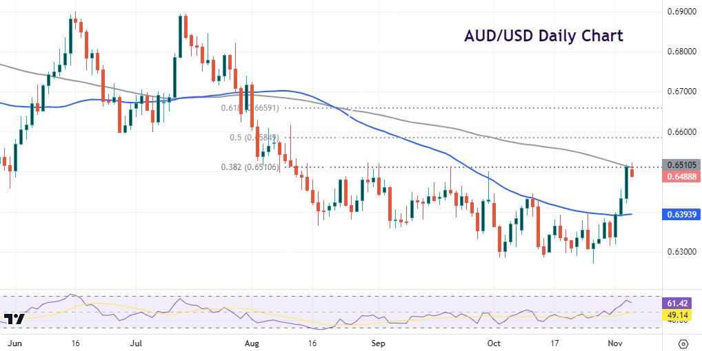 A base has formed around 0.63 after repeated attempts to breakdown through this zone failed over the last few weeks. The last three days of last week which included the Fed meeting, ISM and NFP data, saw a strong rebound taking prices through the 50-day SMA at 0.6394. Prices have now bumped up into the 100-day SMA at 0.6510. This is also exactly where a major retrace level (38.2%) of the July decline resides and prior May lows, plus August and September lows. Buyers will aim for the halfway point of the summer drop at 0.6584 which is just above the March and May lows.