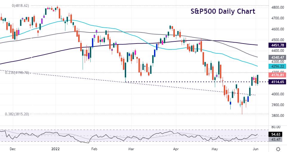 The blue-chip US equity index bounced off a major Fib level (38.2%) of the March 2020/January 20222 move a few weeks ago at 3815. Since then, prices have broken through short-term trendline support from the October low. The last few sessions have seen consolidation around the February low at 4114. Yesterday’s advance closed above this consolidation with bulls looking at the next Fib level (23.6%) at 4198. Above here is the 50-day SMA at 4256 which the index last moved above in March. Support remains at 4114 and 4000.