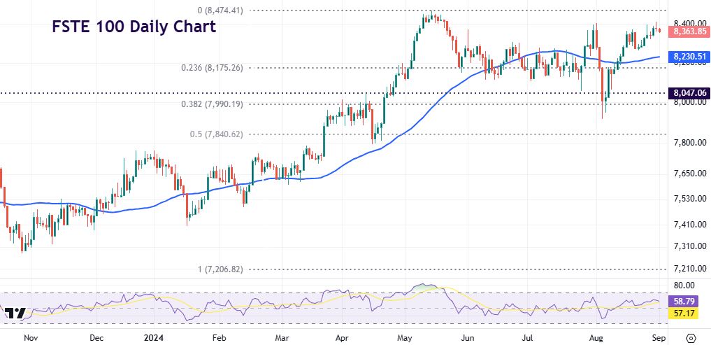 It remains unclear over the pace of UK rate cuts though optimism has been boosted by the relatively strong pound. The record high is at 8474 from May. First major support is 8175.