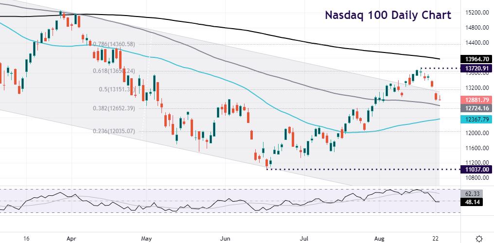 Expectations that Fed policymakers will take a hawkish stance at this week’s symposium in Jackson Hole have hit the rebound in stocks. Higher interest rates can hurt growth and tech companies with high valuations based on future profits. The Nasdaq has certainly been a beneficiary of the market’s hoped-for dovish pivot by the FOMC over the summer. Whether Powell confirms this or sticks to the tightening message on Friday at his keynote speech is key for risky assets.