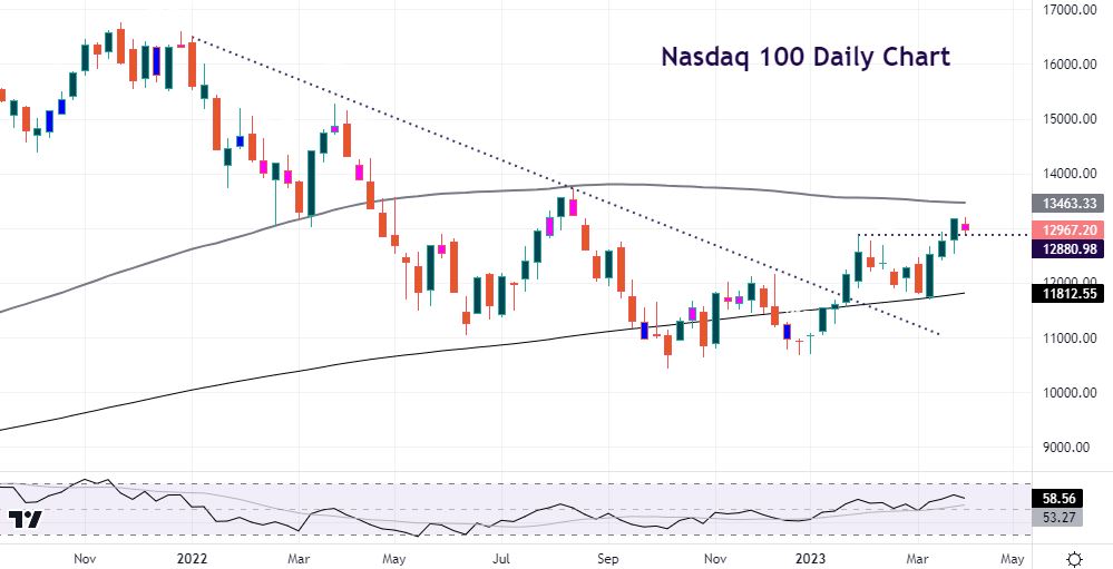 We can see on the weekly Nasdaq chart the previous three week’s of gains. Prices bounced off the 200-week SMA at 11,812. Staying above the January top at 12,880 is key for buyers to maintain the bullish momentum. The next upside target is 13,463 if we get a strong weekly close.