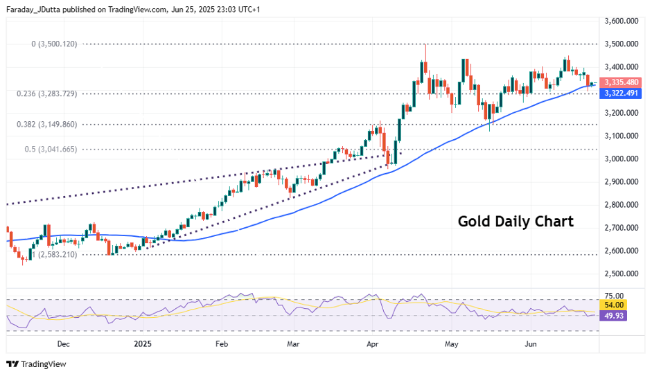 Gold steadied after a sharp sell-off on easing geopolitical concerns around the Middle East. Support has been found at the 50-day SMA at $3,322. See below for more.